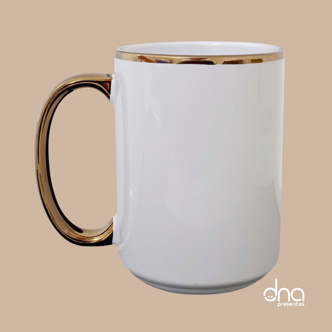 Caneca de Cerâmica Branca com Alça e Colarinho Cromada Dourada 440ml