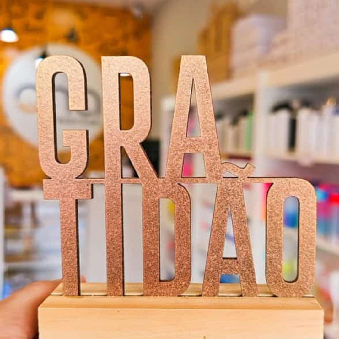 Enfeite Decorativo Dourado com Base de Madeira Gratidão